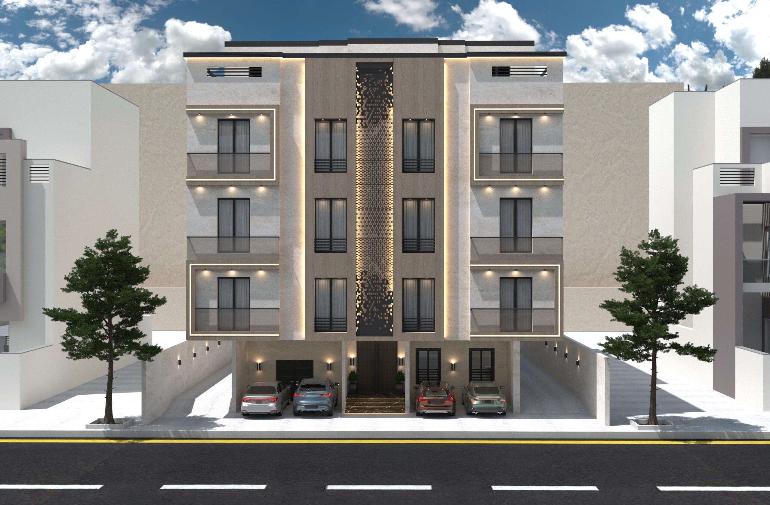 واجهة عصرية أنيقة بتصميم متوازن يجمع بين الحداثة والفخامة، تميزت بتوزيع إنارة جذاب يُبرز تفاصيل الحجر والخطوط العمودية