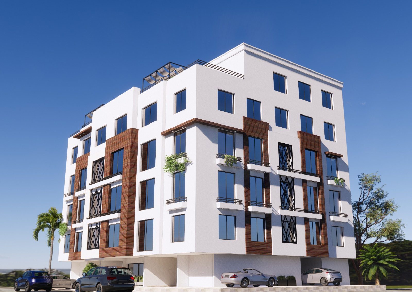 واجهة حديثة بفخامة مميزة وتوازن هندسي أنيق، تتألق بألوان هادئة وإضاءة تبرز جمال التفاصيل